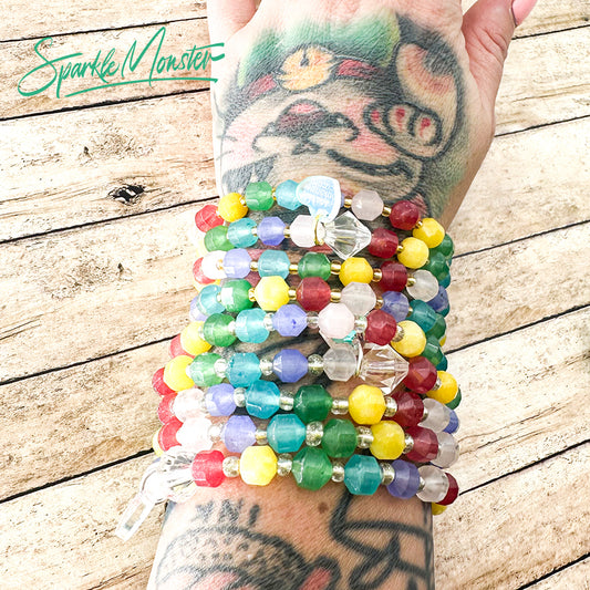 Rainbow gemstone stretch bracelet, gold or silver spacer beads, PRIDE donation