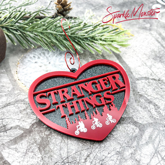Eleven and the Gang, laser cut acrylic ornament, red on black glitter, christmas tree