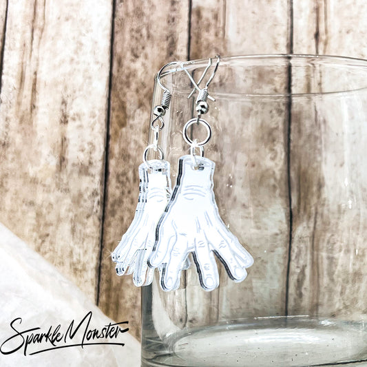 Thing Addams, dangle earrings, silver mirror laser cut acrylic, charms