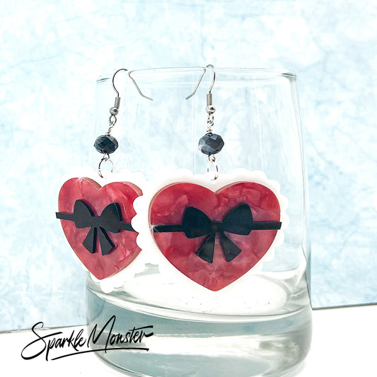 Fancy Valentine Hearts dangle earrings, laser cut acrylic, black crystals