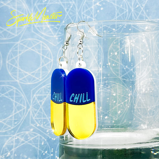 SALE Take a Chill Pill necklace and earrings, blue and yellow