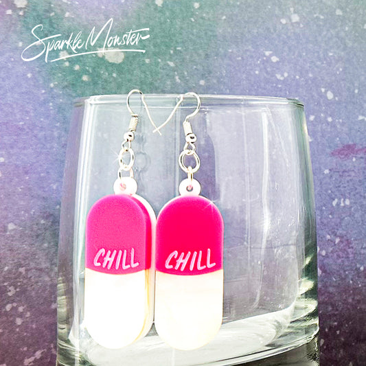 SALE Take a Chill Pill necklace and earrings, hot pink and pearl white