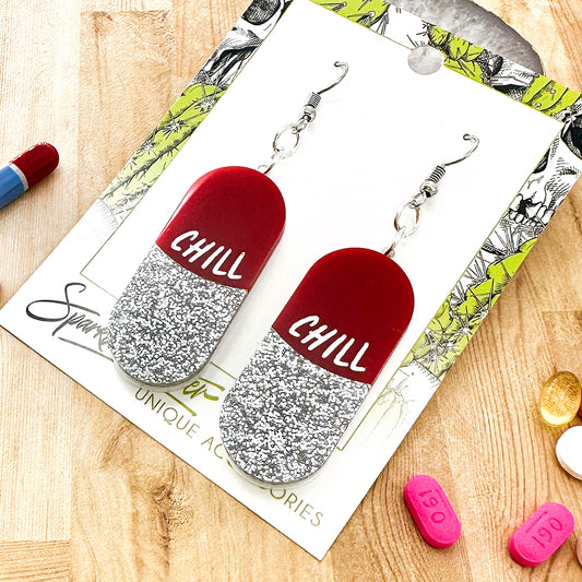 SALE Take a Chill Pill earrings and necklace, red and silver glitter