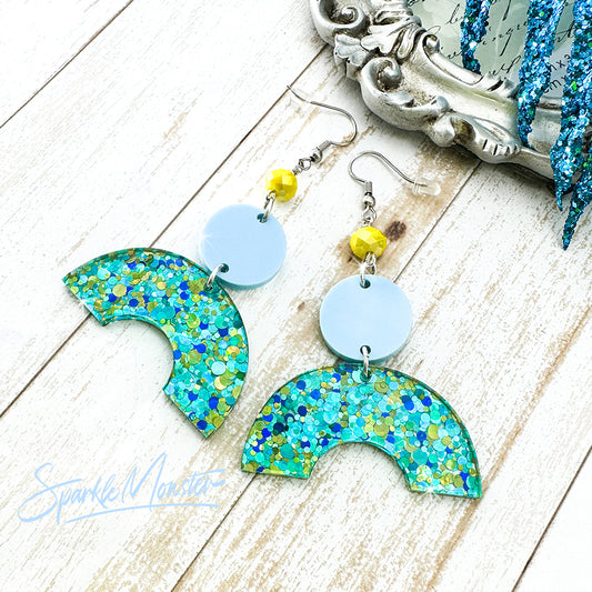 SALE Aqua Arches, glitter dangle earrings, laser cut acrylic, turquoise and yellow
