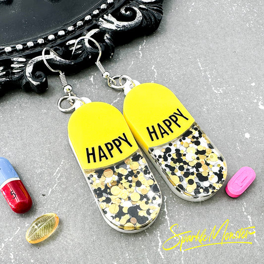 SALE Happy Pills necklace and earrings, bright yellow glitter