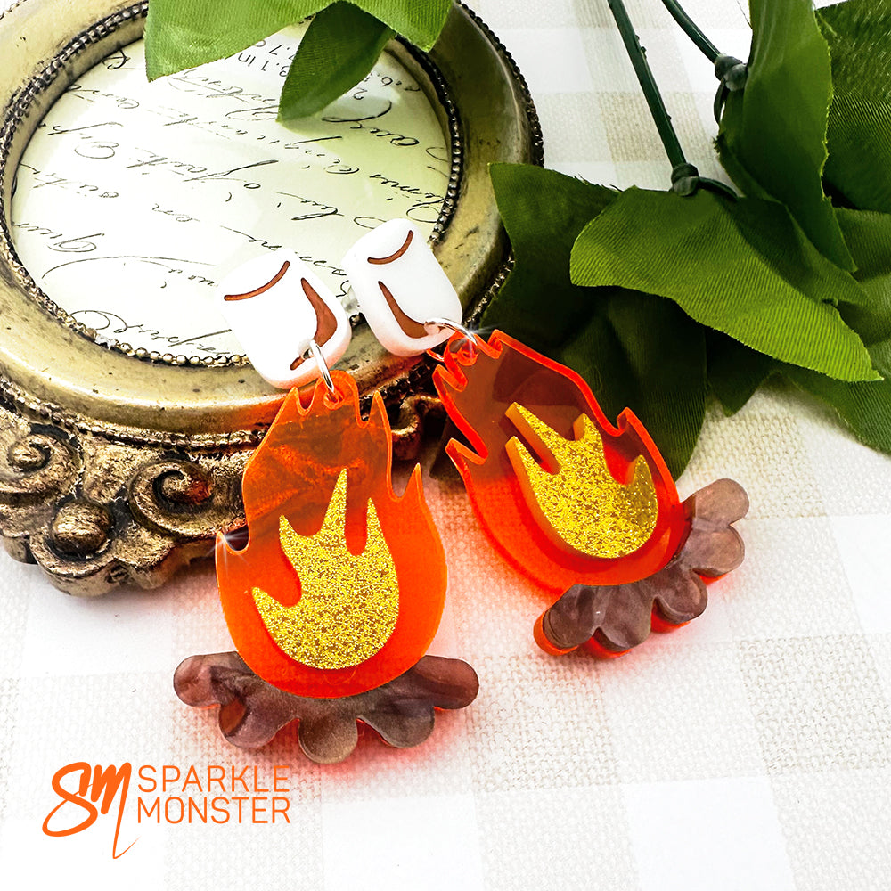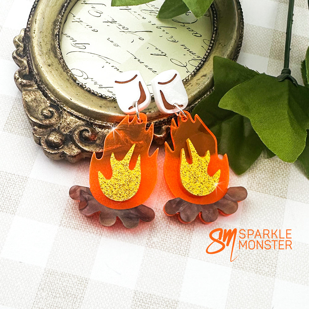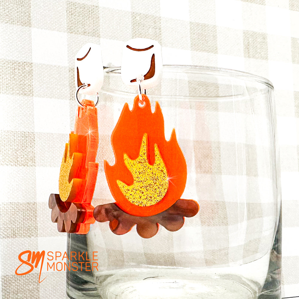 These Campfire dangle earrings bring a bold pop of neon orange and yellow glitter acrylic, capturing the playful glow of a campfire.