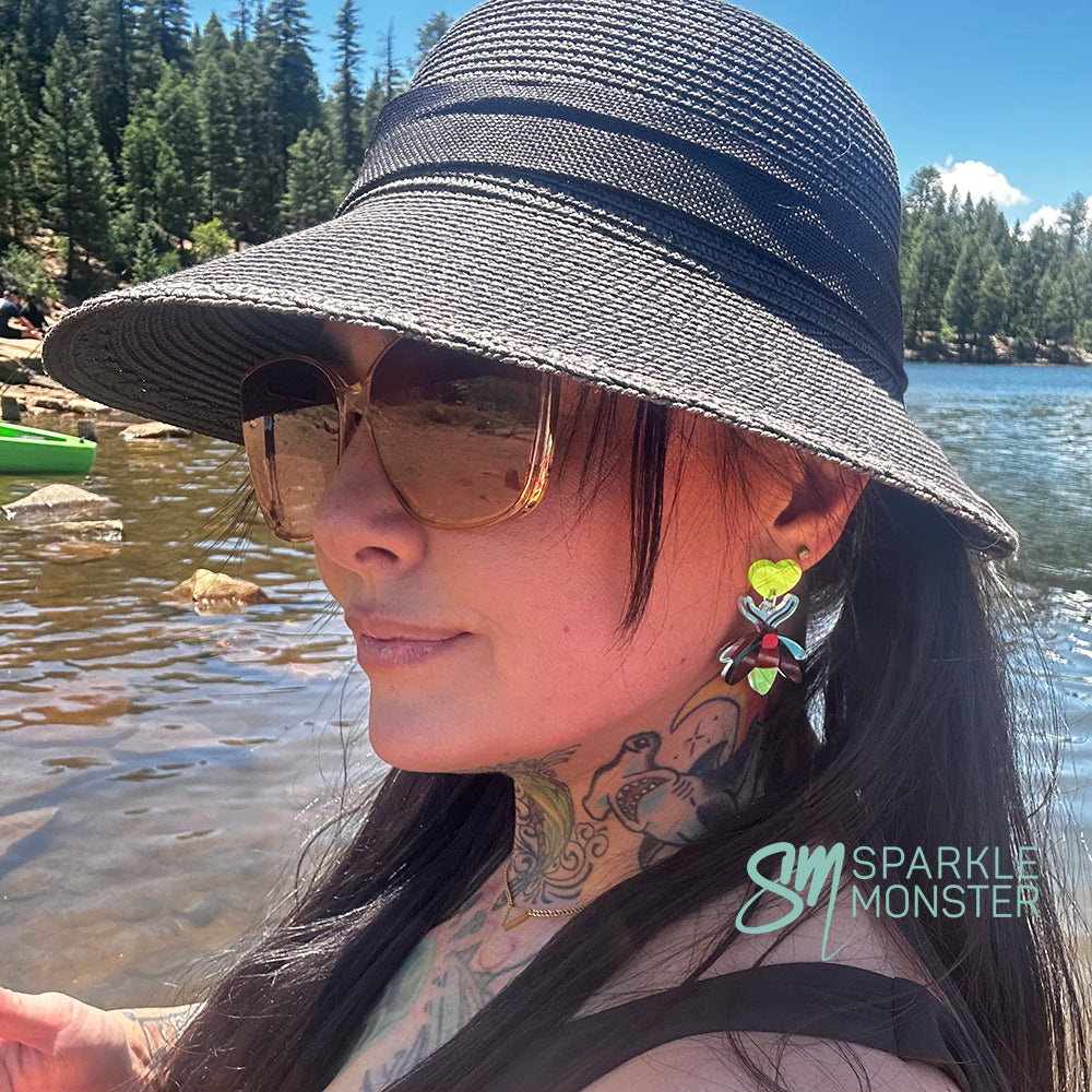 Featuring neon yellow glitter and iridescent accents on black and brown acrylic, each pair is laser cut and hand assembled with delicate hand-painted details.