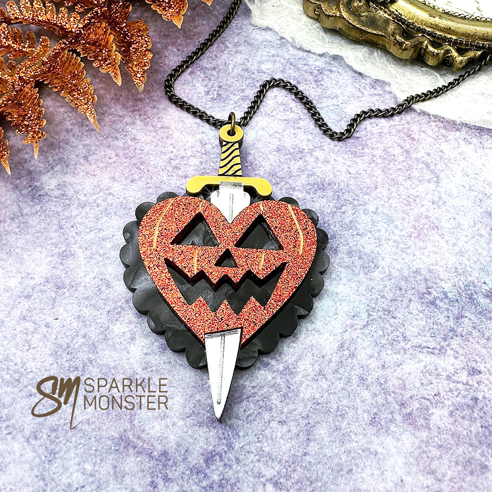 Embrace the dark enchantment of the Pumpkin and Dagger necklace, featuring a striking orange glitter jack o’ lantern.
